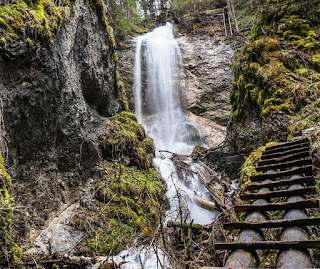 Az impozáns sziklafalon két híd is átszeli az alábukó patakot, a közel 80 méteres létrarendszer pedig meredeken ível fölfelé. Az első, rozoga vaslétra nem a sziklafalra lapul, hanem ívben hajlik rá, hogy a tetején egy kis híd keresztezze a vízesést. A legfelső létra fokaiba már szédületes magasságban kapaszkodtunk. A tövénél, amely egyben az alá érkező létra teteje is, csak egy hajlott vastálca lógott ki félig a sziklafalból.