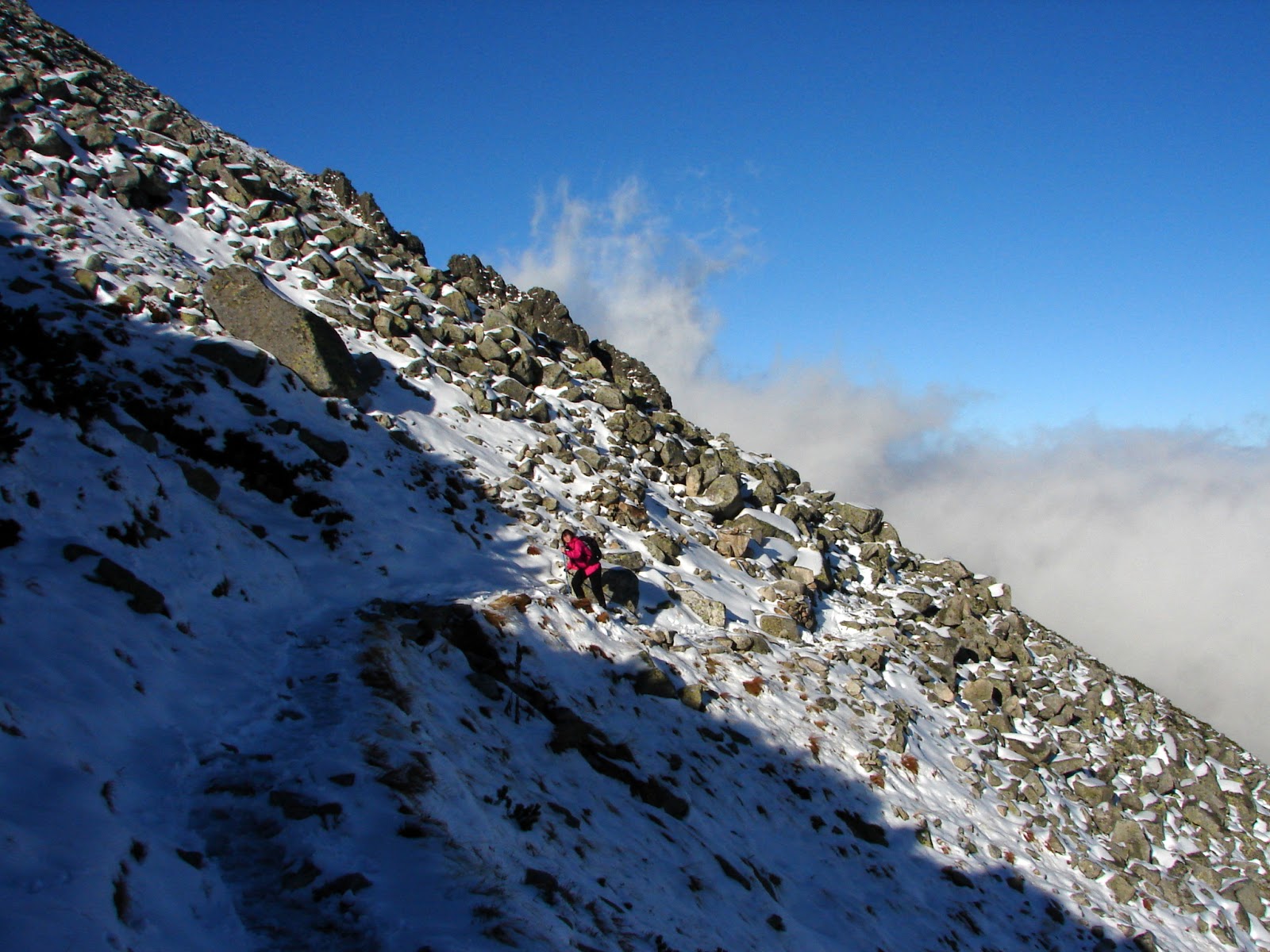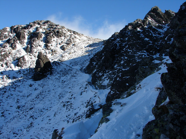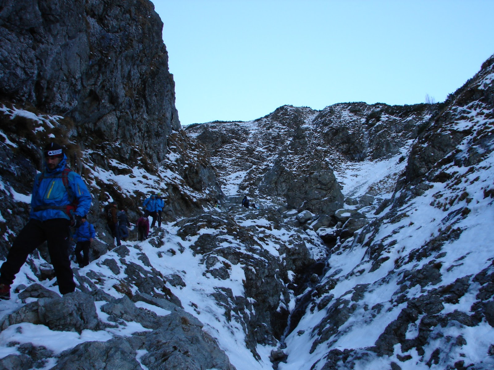 A kicsiny Késmárki-Fekete-tó (Čierne pleso, 1579 m) teljesen árnyékba burkolózott, így gyorsan magunk mögött hagytuk, majd kisvártatva megérkeztünk az út technikailag legnehezebb részéhez, a láncokkal biztosított vályúhoz. A menedékháztól alig találkoztunk turistákkal, itt azonban egy egész turistacsoport jött velünk szemben, így aztán amíg elengedtük őket, volt idő felvenni a hágóvasat. A jól letaposott havas úton a hágóvas mindenképpen nagyobb biztonságot jelent, főleg azoknak, akik kevésbé biztosak a saját léptükben.