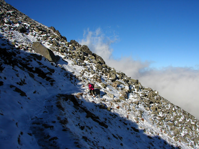 Már a Kő-pataki-tó közelébe jöttek szembe az első turisták, akik szintén magyarok voltak, majd a délutáni időpont ellenére egyre több szembe jövővel találkoznunk. Mivel ekkor már fél 4 körül járt az idő, el is gondolkodtam rajta, hogy ők vajon hová indulnak ilyen későn. Bár még az őszi óraátállítást megelőző napon voltunk, de 6 órakor már ekkor is besötétedett. Ha csak a Nagy-Morgásra terveztek felmenni, majd onnan vissza, akkor biztosan nem érik el az utolsó felvonót, vagyis sötétben kell lemenniük. Ha a Zöld-tóig terveztek eljutni, az a télies körülmények között, a havas turistaúton éppen hogy beleférhet 6 óráig, de aztán még onnan is le kell jutni valahová. Hacsak nem alszanak fent a házban…