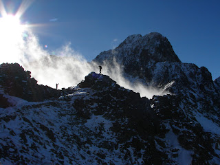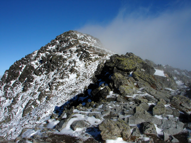 Ahogy közeledtünk a hágóhoz, egyre erősödött a szél, ez azonban nem akadályozott minket a haladásban. A szélnek, a szélben táncoló felhőknek köszönhetően viszont a Nagy-Morgás-hágóba (Sedlo pod Svišťovkou, 2023 m) érkezve nem mindennapi látványt sikerült megörökíteni. Egy fiatal pár haladt néhány méterrel előttünk, akik így pár perccel előttünk értek fel. Ennek köszönhetően mi még a szerpentin utolsó métereit tapostuk, amikor ők már a hágóban fotózták egymás. Én pedig őket, mégpedig háttérben a szél által ördögi sebességgel forgatott felhőkkel és kék éggel…