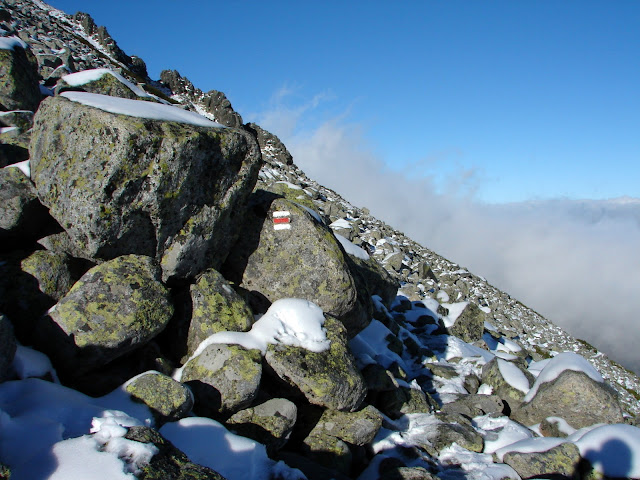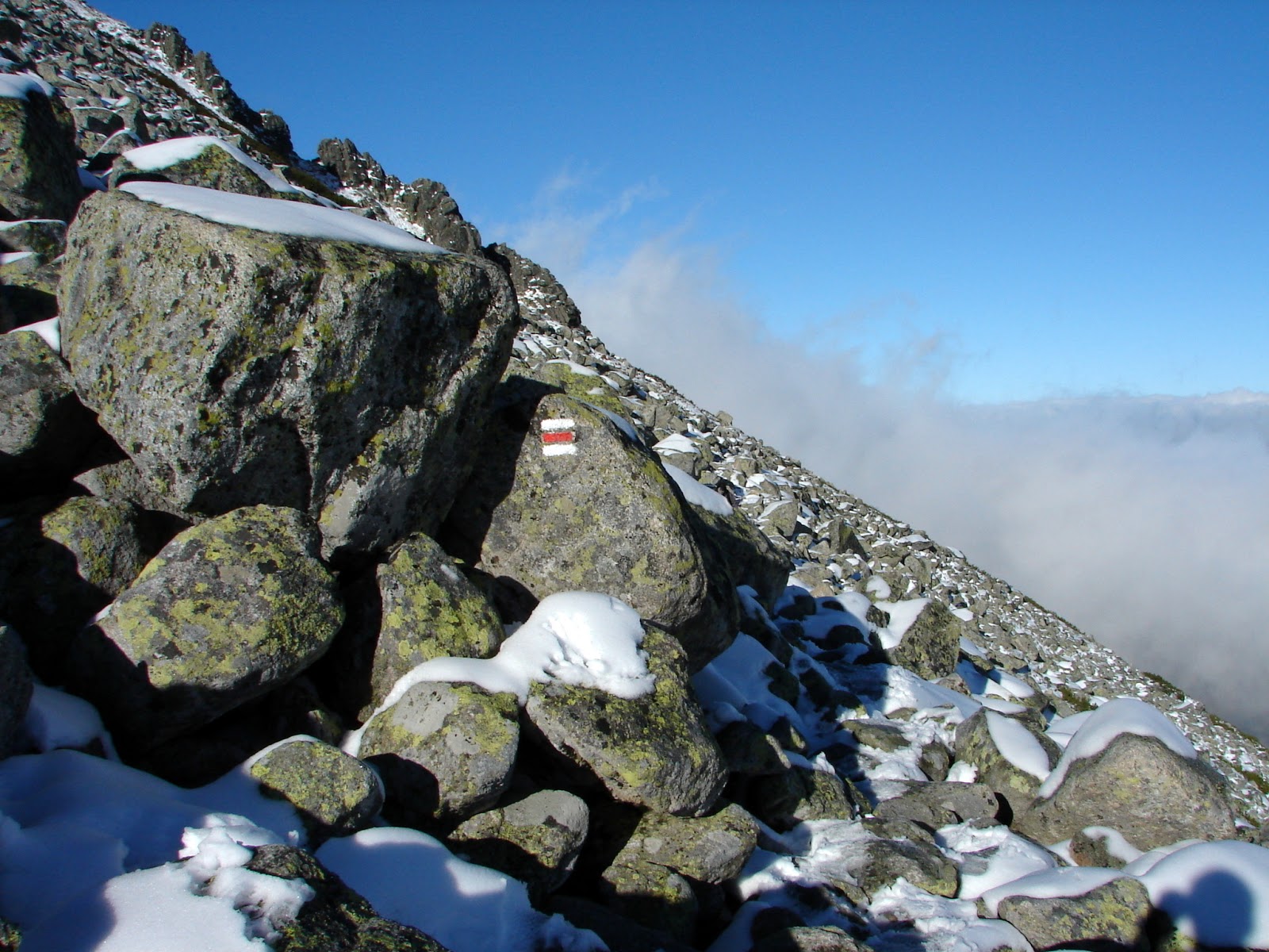 Valamivel fél 3 előtt érkeztünk meg a hágóba, és bár terveztük, az akkor éppen napfényben fürdőző Nagy-Morgás (Veľká Svišťovka, 2037 m) csúcsára idő hiányában ezúttal nem mentünk fel. Szerettük volna ugyanis elérni a Kő-pataki-tótól lefelé induló utolsó felvonót, mivel az onnan még előttünk áll 900 méter szintkülönbségű, meglehetősen barátságtalan terepen, a sípályákat többször keresztező utat nem volt sok kedvünk feltérképezni.