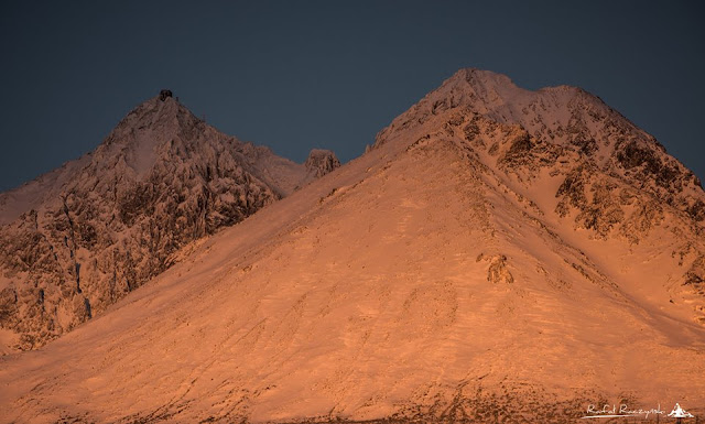 A Lomnici- és a Késmárki-csúcs a felkelő nap fényében.