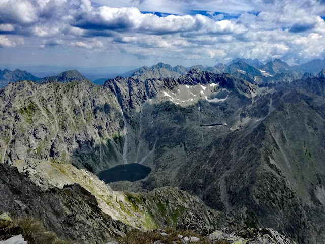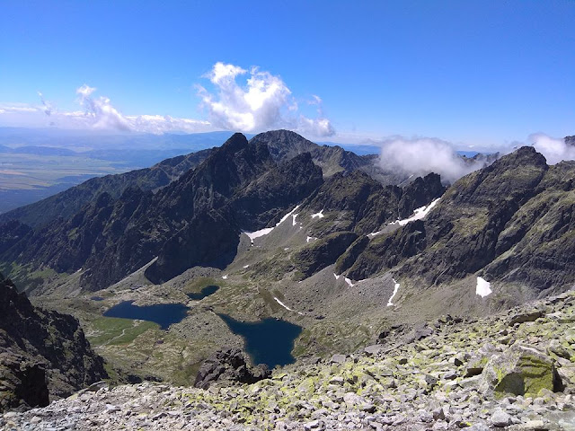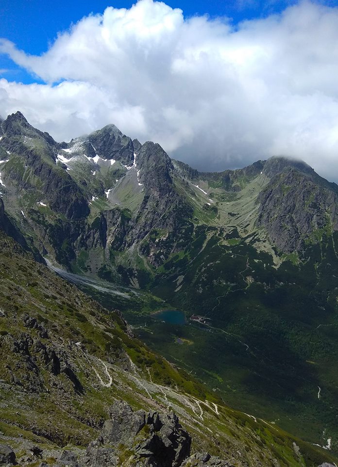 Kilátás a Zöld-tavi-csúcsra vezető útról az Öt-tavi-katlanra.