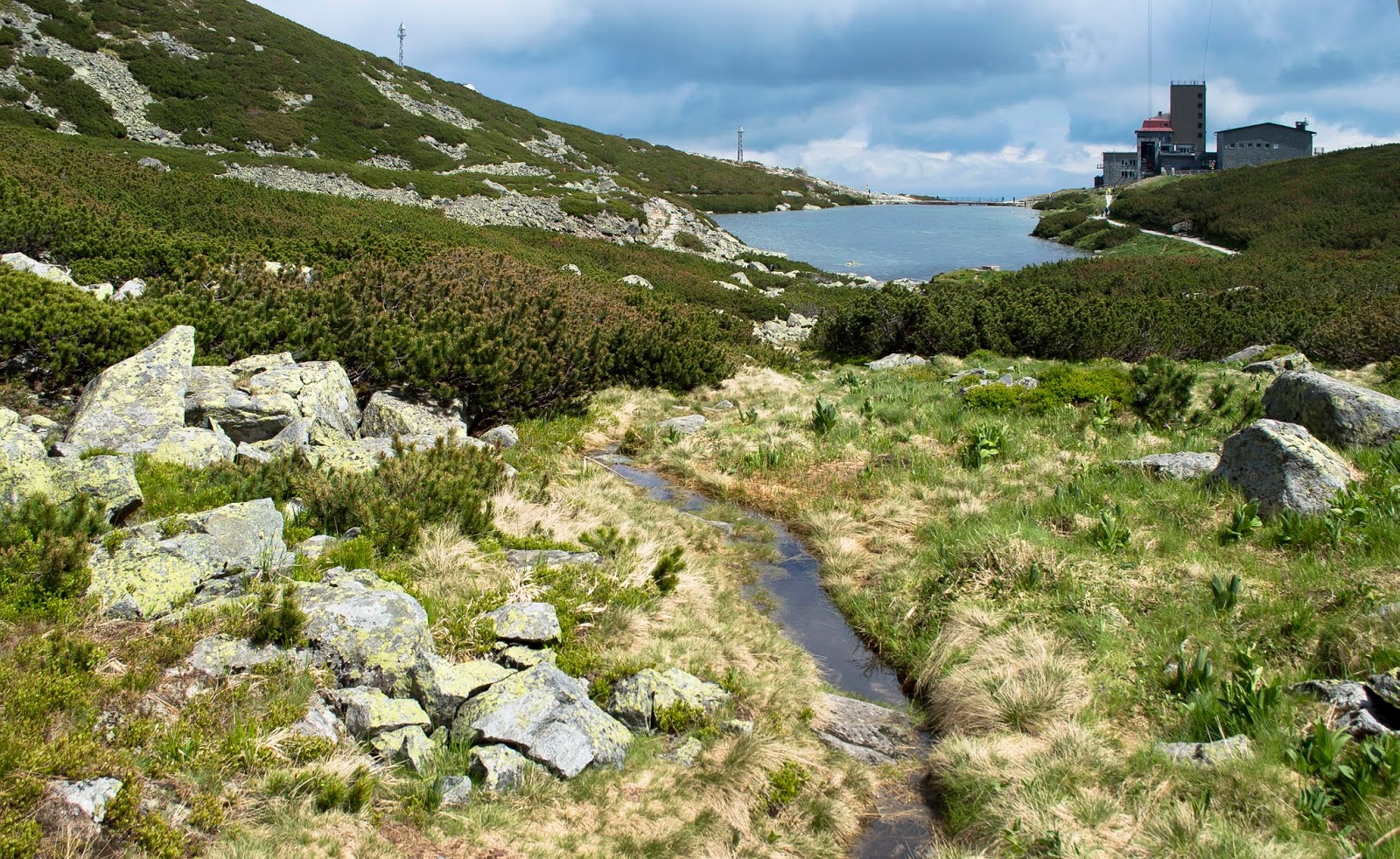 10 perc alatt a hegyen voltunk, 1751 méteren, közben egyre jobban kitisztult az ég,  és körbejárván a Kő-pataki-tavat (Skalnaté pleso), megcsodálhattuk annak vizében az ég visszatükröződő kékjét. Vagy zöldjét, attól függően, hogy honnan néztük.