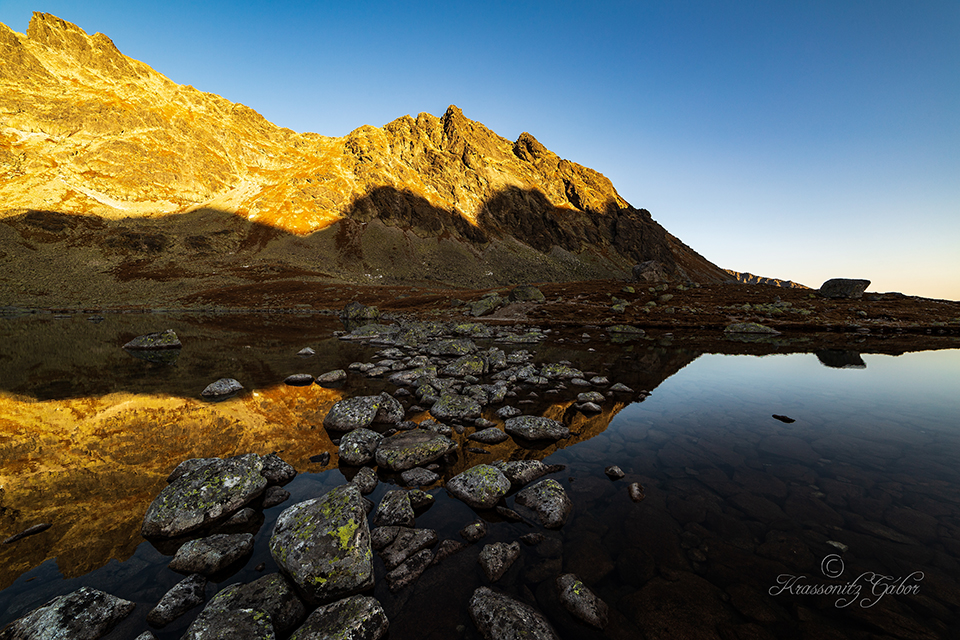 2018 október végén egyik Tátrai túra célunk a Kapor-csúcs volt. A hegy azonban ismét gondoskodott róla, hogy nehezítse odajutásunkat. Annyi látnivalót mutatott magáról útközben, hogy egész nap csak ezt mondogattuk : „oda nézz, milyen szép, itt is álljunk meg”. Na, így messze van ám a Kapor-csúcs! A késő őszi napok, meg amúgy is rövidek már. Még csak a Menguszfalvi-völgy tetején, a meredek, kanyargós, köves ösvényen bandukoltunk felfelé, de a völgy, már rég árnyékba burkolózott alattunk. A tiszta égen a napot már nem láttuk. A hőmérőben a folyadék is tudta, mit ésszerű ilyenkor tenni, elindult gyorsan lefelé, akár csak az összes ember rajtunk kívül. Azzal tisztában voltunk, hogy rövidített túra lesz, a Kapor-csúcs ugrott, de az 54 méter mély tavat még szerettük volna látni.