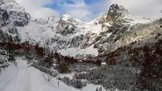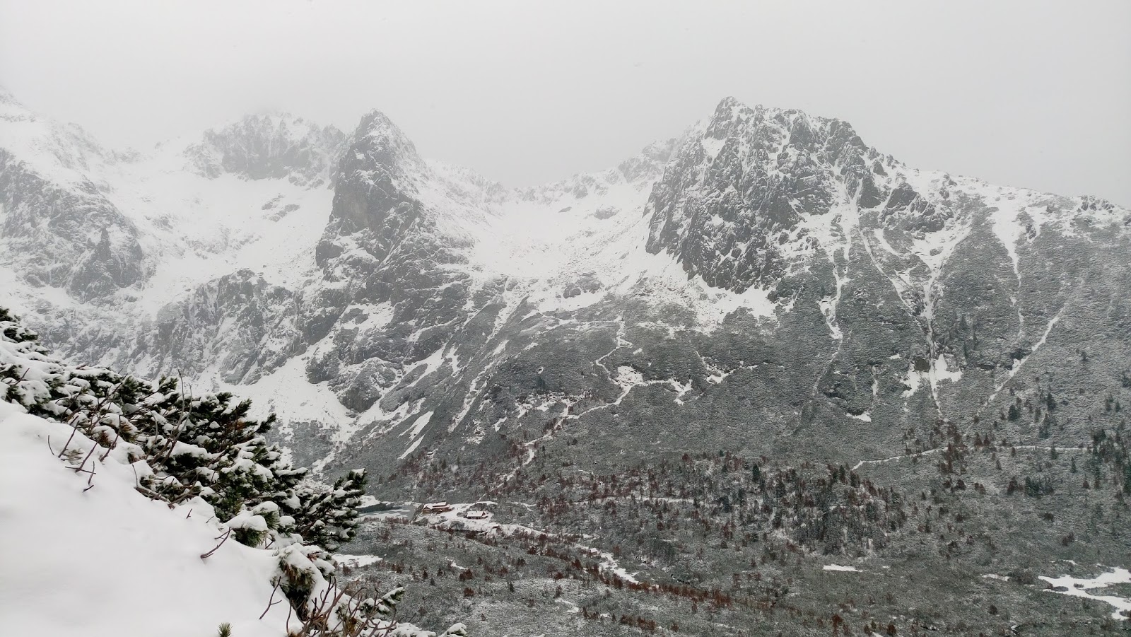 Túl voltunk az első részhajrán, ettől azonban még hajnali, álmos fényekben keltünk át az úton, és elindultunk felfelé a Fehér-víz (Biela Voda, 925 m) autóbusz megállótól induló sárga jelzésű turistaúton. Aki ismeri, tudja, ez a jelzés szelíden kanyarog fel egészen a Zöld-tó (Zelené pleso, 1545 m) partjáig. A szintemelkedés (620 m) akár jelentősnek is mondható, de nagyjából „jól” oszlik el a hét és fél kilométer hosszú távon. Ez az útvonal nyáron bátran ajánlható kisgyermekes családos túraként, de sportosabb családok akár télen is próbálkozhatnak vele.