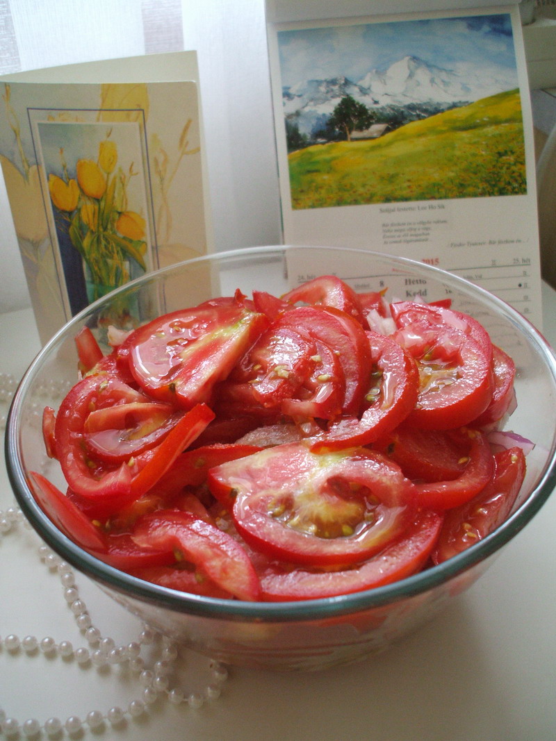Paradicsom szezonban vagyunk, nyáron szinte majdnem mindennap eszünk paradicsomot, és hetente többször is van vacsorára paradicsomsaláta! Imádjuk! Egyszerűen nem lehet megunni! Jól behűtve, összeérve a legfinomabb, egyszerű, olcsó, és gyorsan elkészíthető! 5 perc! A paradicsomokat és lila hagymát felkarikázom, Himalája sóval megsózom, és leöntöm extra szűz olívaolajjal, nekünk a görög olaj a kedvencünk! Tehetünk hozzá fekete olívabogyót is, vagy tofut... de önmagában is nagyon finom! Igazi hűsítő nyári étel!
