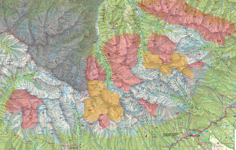 Egy cseh weboldalon jelent meg az alábbi térkép, melyen a készítők különböző színekkel jelölték a Magas-Tátra azon területeit, melyeken teljesen, vagy részben tilos a mozgás, túrázás, hegymászás.