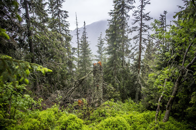 A nehéz terep és meredek lejtő ellenére ezen a területen nyilvánvalóan egy medvecsalád él – rendszeresen találkozunk aránylag friss medveürülékkel. Az út mellett több helyen „medvefákat” is látunk, ezeken keresztül váltanak üzenetet egymással ezek a hatalmas mindenevők. A nőstények például itt jelzik, hogy készen állnak a párosodásra, a hímek pedig figyelmeztetnek, nehogy valaki véletlenül a territóriumukba tévedjen. Néhány jelzőfa, amit a medvék használnak, egészen hatalmas, de vannak köztük vékonyak és aprócskák is. A közös bennük, hogy a medvék karmainak és fogainak nyomait viselik, és medveszőr is van rajtuk.