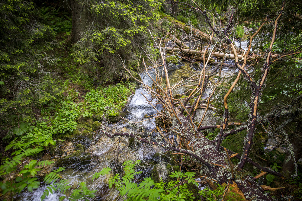 Mindenütt zuzmók, mindenféle mohafajták, amilyeneket másfelé nem is lehet látni, és több száz- akár ezeréves cirbolyafenyők. Nagyon régen állnak itt, Baláž körülbelül kétszáz éves bevágásokat mutat az egyik vastag fenyőtörzsön. „A gyantagyűjtők így termelték ki a gyantát, amit gyógyítási célokra és a borókapálinkához (limbovica) is használtak”. A borókapálinka vodka alapú alkoholos ital, amely sajátos ízét a fiatal, gyantával teli cirbolyatobozoktól kapja. Valóban gyantaíze és kellemes gyógynövényillata van.